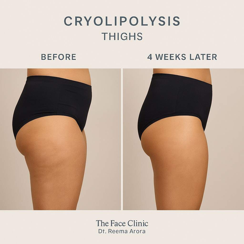 Tired of stubborn thigh fat? Cryolipolysis at The Face Clinic by Dr. Reema Arora offers a non-invasive solution that freezes and reduces fat safely. In just four weeks, achieve smoother, firmer thighs without pain or downtime. Perfect for those looking to sculpt their legs naturally. Book your consultation and step into confidence today!